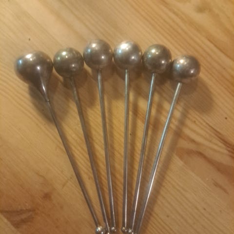 Sæt med 6 cocktailpinde i metal med bladformede hoveder. Egnet til brug ved servering af drinks og snacks. Materiale: metal. Farve: sølv. Antal: 6 stk.