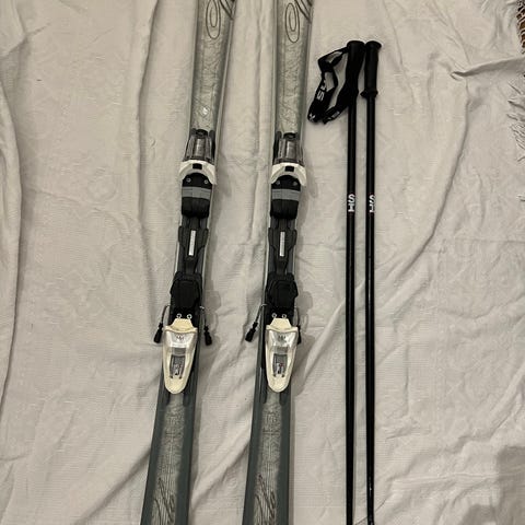 Salomon skisæt bestående af et par ski 170 med bindinger og et par skistave 125. Skiene har et grafisk mønster i sort og gult. Skistavene er grønne med sorte håndtag. Kan fåes lidt billigere uden stave