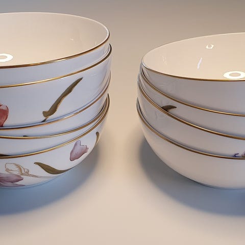 Royal Copenhagen, Flora Rhododendron skål. Fremstillet i porcelæn med dekorative lilla blomster og grønne blade. Skålen har en rund form og er velegnet til servering eller opbevaring af mad.
