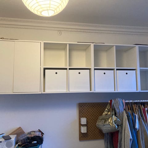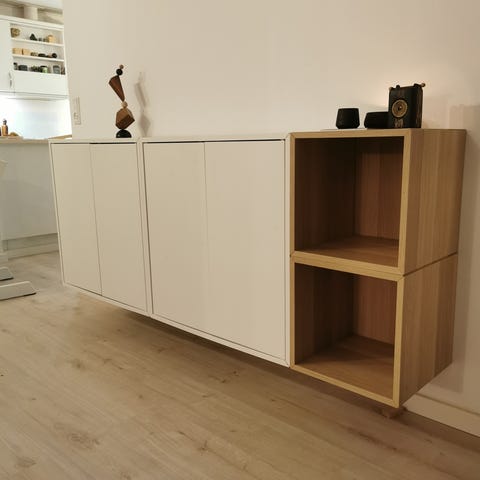 4 stk hvide reoler med 2 skuffer i hver og 4 stk kvadratiske reoler i egetræsmønster. Der medfølger vægskinne til alle 8 sektioner samt 4 filt-kurve.