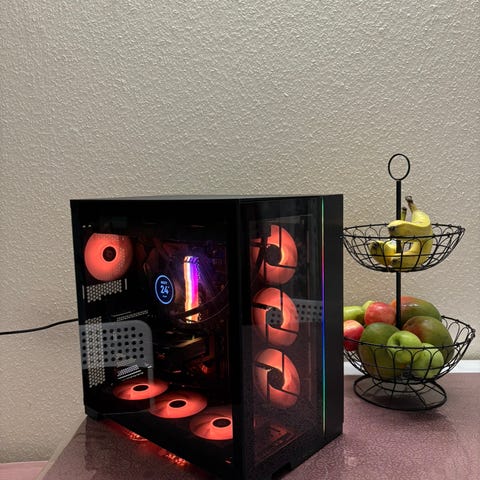 Computeren er sat op med 3x intake og 1x rear outtake med premium QL RGB fans, så der er optimalt flow. Der kan eventuelt udstyres med vandkøler og med top exhaust fans