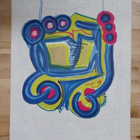 Anders Nyborg kunsttryk med et abstrakt motiv i blå nuancer. Trykket er indrammet og viser en komposition med figurer og former i forskellige blå og gule toner.