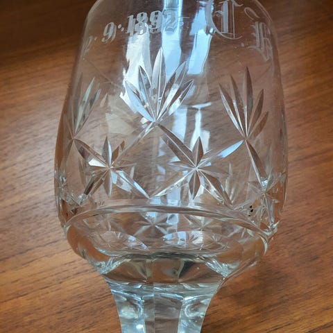 Glas med indgraveret mønster og tekst. Glasets materiale er klart glas med detaljer i form af floral gravering og teksten “til erindring”