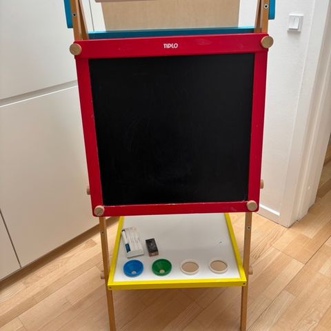 Staffeli med lille hylde med “ børnelås” som sikrer det ikke bare slår sammen, så du kan opbevare dine materialer. Den ene side er whiteboard tavle mens den anden er tavle, herpå er der tegnet med alm farver som ikke går af med vand, se foto