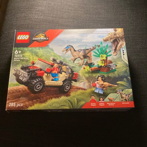LEGO Jurassic World legetøj med 199 dele. Sættet indeholder T-Rex og Teresa og Xavier båd, motorcrosser og hytte.
