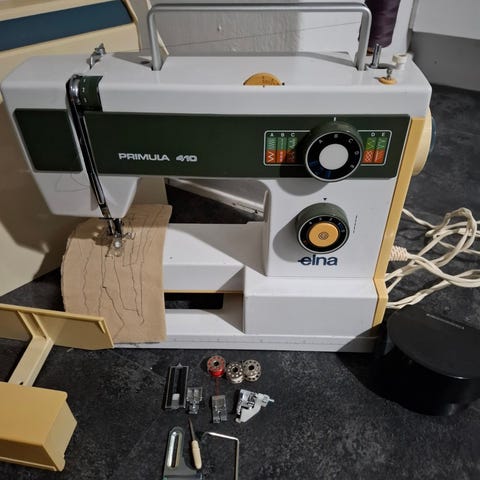 Maskinen har mest været brugt til kraftige stoffer og skind som den har klaret fint med de rigtige nåle. Der medfølger en del ekstra trykfødder og trådspoler.