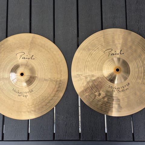 Hihatten er en 14" Paiste 101, som fungerer og lyder som den skal. Den har tegn på brug. Pearl-stativet er et godt og stabilt stativ i god stand. Rigtig godt begyndersæt, som er lige til at tage i brug.