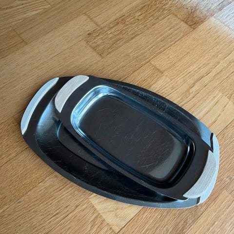 Det største fad og det runde er begge i stål og temmelige solide.