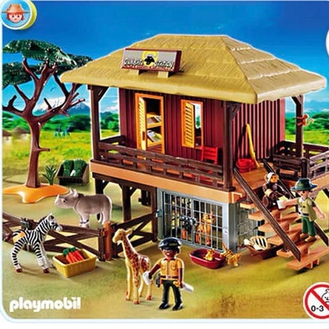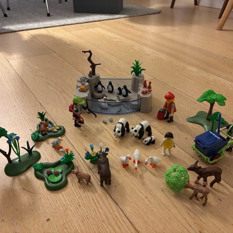 Playmobil MiniZoo legesæt med indhegning, træer, klippeformationer, zebra og struds samt andre figurer.