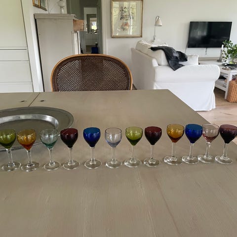 2 små fine gule snapseglas, de er ikke ens. 60 kr. for begge. Sendes gerne, mod modtager betaler for portoen.