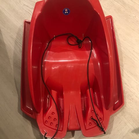 Buko kælk i rød plast med håndtag og reb til træk. Designet til børn til brug på sne.