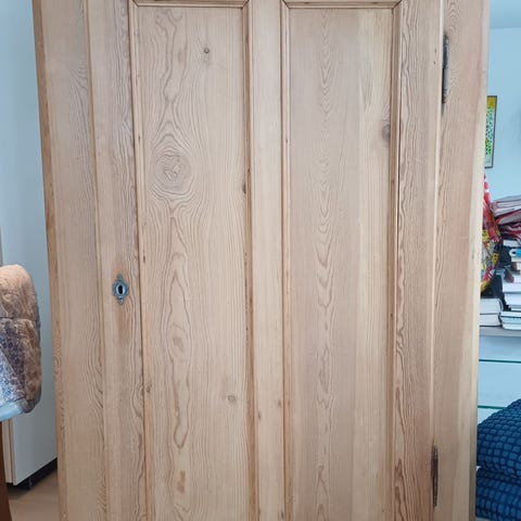 Ældre karlekammerskab med flot mønstermotiv, lås med nøgle og hylder indvendig