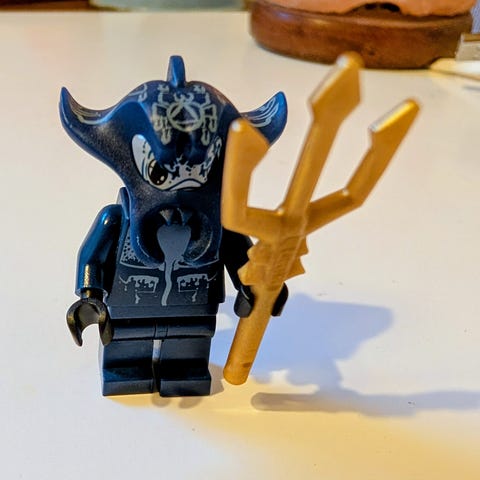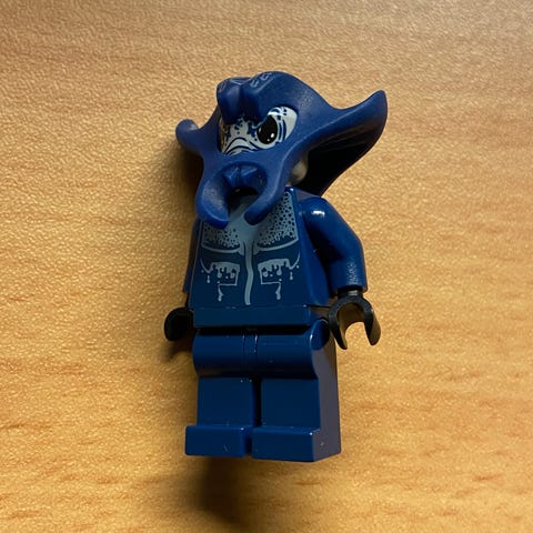 LEGO Atlantis dykker minifigur med grøn og sort farvetema. Figuren har detaljeret tryk på torso og ben, samt en aftagelig hjelm med gennemsigtig grøn visir. Figuren er lavet af plastik og er en del af LEGO's Atlantis ace speedman