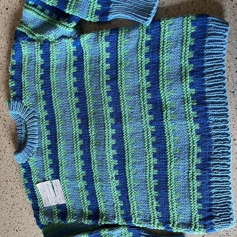 Poncho, Håndstrikket, Mayflower, str. 104, Smuk turkis, brystmål 80 cm. Længde 40 cm. I blød og varm kvalitet 30 % bomuld, 21 % uld, 21 % alpaca. Små elefant knapper og der kan åbnes i begge sider.