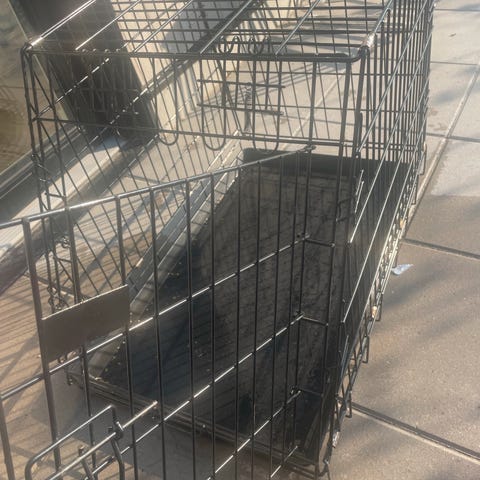 Hundebur med dimensionerne 122x122 cm og en højde på 60 cm. Buret er lavet af metal og er egnet til opbevaring eller indhegning af hunde. Som det ses kan en duret en hundeseng og et tæppe samt nogle hundelegetøj stå i gården. Der er nogle plastfødder med som giver bedre stabilitet.