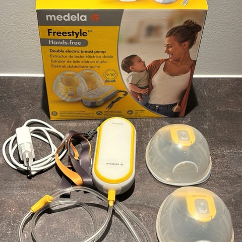 Medela Freestyle elektrisk dobbelt brystpumpe til udmalkning af brystmælk. Inkluderer pumpeenhed, slanger, brystskærme og tilbehør. Designet til nem og effektiv udmalkning, egnet til mødre der har behov for at pumpe mælk regelmæssigt.