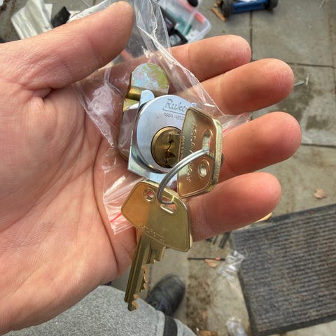 Ruko profilcylinder 1602 i messing med tilhørende nøgler. Låsen har en dreje greb og er velegnet til døre, hvor der ønskes ekstra sikkerhed og nem betjening fra den ene side.