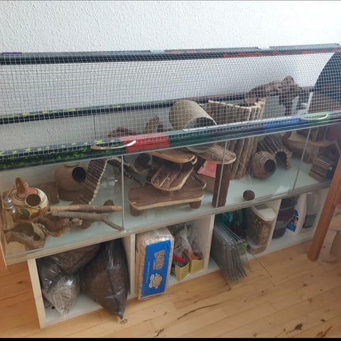 Flot og praktisk rottebur i fin og brugbar stand, med brugsspor - lidt rust, gnavemærker i den sorte plastikbund og en enkel løs tremme, som ikke har haft betydning for mig.
