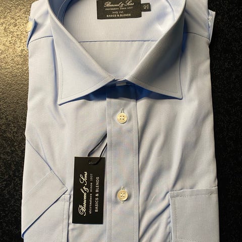 2 BOSWEL Skjorter til herre i størrelse 42. Skjortene har et ternet mønster i blå nuancer og grå er fremstillet i bomuld. De har lange ærmer og en brystlomme på venstre side. Skjortene har knaplukning foran og en klassisk krave. Materialet og designet gør den velegnet til hverdagsbrug.