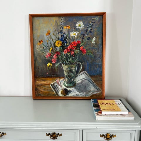 Blomsterbuket i vase på bord indsat i sølvramme. Str. B: 28 h: 34. Kunster: Svane.