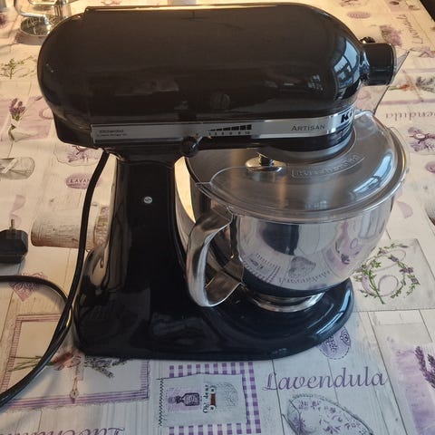 KitchenAid rødmixermaskine med rustfri stål skål. Maskinen er udstyret med flere tilbehørsdele til blanding og piskning. Den har et klassisk design og er velegnet til forskellige køkkenopgaver som bagning og madlavning.