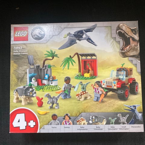 LEGO Jurassic World LEGO sæt: Dinosaur Mission: Stegosaurus Discovery med forskellige figurer Ben og Sammy), en Stegosaurus og en velociraptor, træ, køretøj og tilbehør.