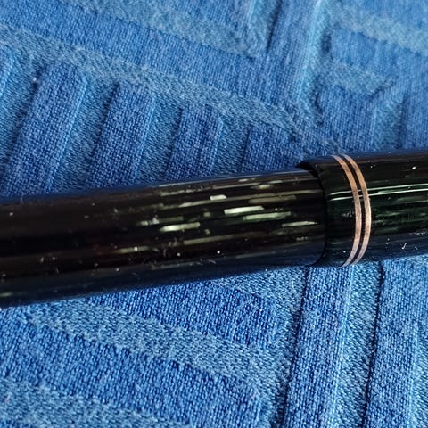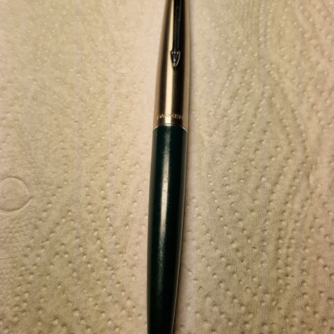 Sort Parker vacumatik fyldepen. Spids 14k guld.Har mærker i toppen af skruelåget. Se billede: Ellers pæn stand ift alder, normale slidmærker efter brug. Intet personligt navn på. Reg n. 784404