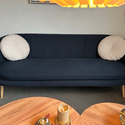 Mørkeblå 2-personers sofa i stof. Har næsten ikke været brugt og står som ny. Nypris i dag i JYSK: 2.299 kr. Den har sæde- og ryghynder i skum. Ben i massivt træ. Bredde: 137 cm - Højde: 78 cm - Dybde 76 cm