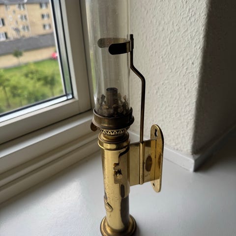 Harnisch skibslampe mener det er en Holmegaard skærm der sidder på. Kan ses/eventuelt afhentes i Horsens.