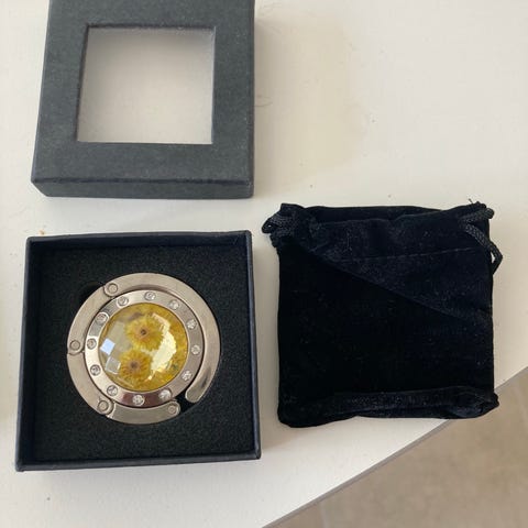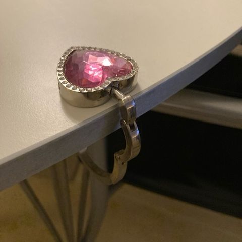 Bag holder, to be put on the table edge, hang your bag or carrying bag etc. on the hook and let go of dirty floors. Inclusive velour bag. Ideal girlfriend gift.