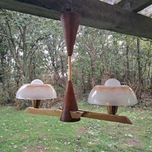Fem armet loftslampe i teak/messing med 5 glaskupler. Lettere patina på messing.
