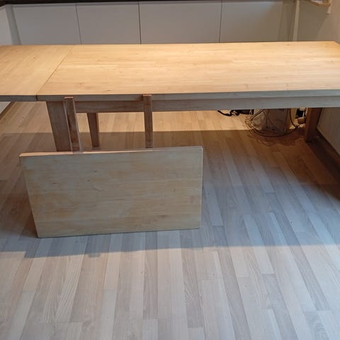 Spisebord i massiv bøg med 4 stole og udtræk. Bordet er ø120 uden plader og med plader 120 x 216. Afhentes i Albertslund.
