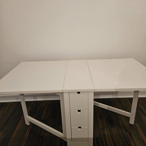 Bord med 2 klapper og 6 skuffer. Plademål 152 x 80, 90 x 80 eller 33 x 80