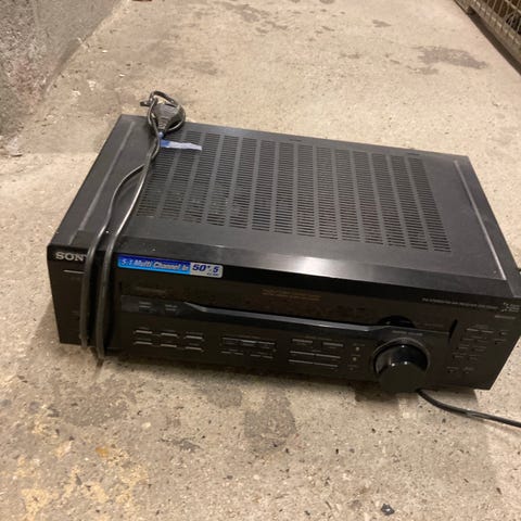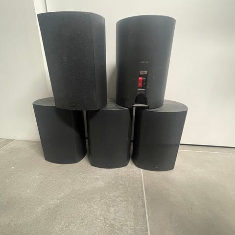 Sony 5.1 Receiver kombineret med højttalere fra Tannoy Mercury M1 B/Eye, Cerwin-Vega VE-5M og VE-5C samt Jamo E4SUB.1 subwoofer. Højttalerne har forskellige tilslutninger og er lavet i forskellige materialer. Produktet er velegnet til hjemmebiograf- og lydsystemopsætninger.