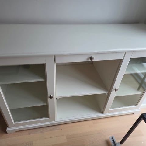 Reolen er oprindeligt uden låger i bunden. Lågerne stemmer fra en Liatorp skænk.