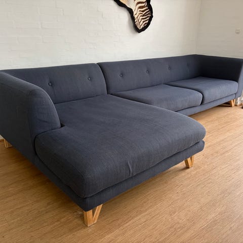 Smuk og elegant sofa i petroliumsblå velour. Gode fjedre, medium hårdhed, så den er behagelig. Målene er taget til yderpunkterne.