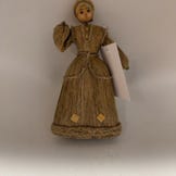 Dukken har hånd hæklet gul og hvid kjole på og under kjolen er der hemmeligheder