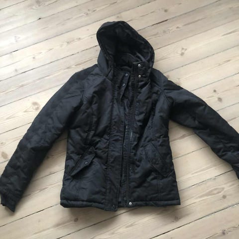 Sort hummeljakke med guldmønster på ærmerne. Lommer med trykknap, hætten kan ikke tages af.