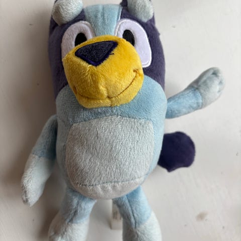 Bluey bamse legetøj i blødt materiale. Produktet forestiller en karakter fra Bluey-serien og er egnet som børnelegetøj.