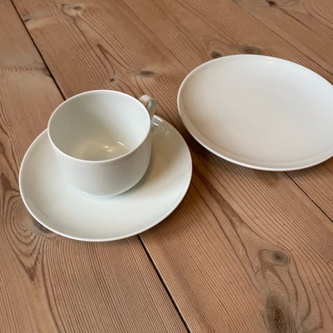 Bing & Grøndahl hvid palet kopper i porcelæn med et reliefmønster på ydersiden. Kopperne er hvide og har hank. De egner sig til servering af varme drikke som kaffe eller te. God stand. Lidt prikker i ene kop. Samlet pris