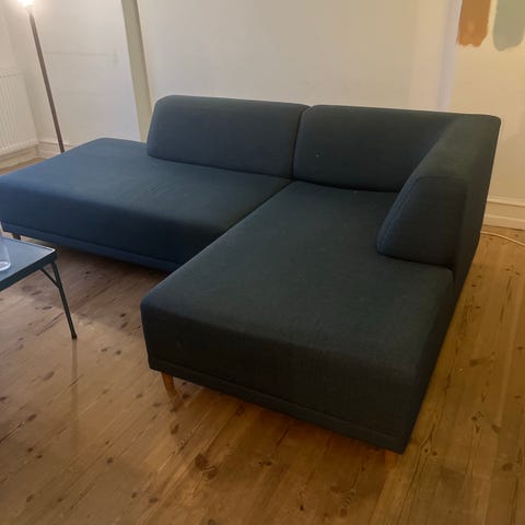 Da vi downsizer vores sofa sælges midterste modul af mørkeblå sofa fra Formel A. Virkelig fin stand - et sted er et mindre hul i syning.