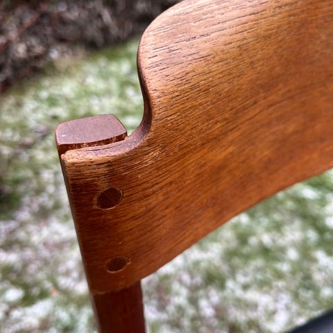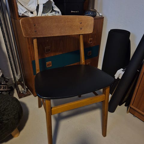 Teaktræs stol med sort ‘læder’ sæde (ikke ægte læder) Flot skulpturelt ryglæn