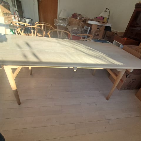 6 stole og et spisebord m . Plader - ka blive 3 meter - 2 små skader i flet på stole - bord og stole ka evt sælges hver for sig