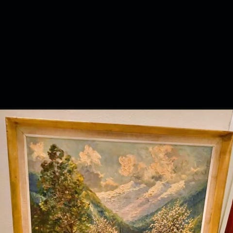 Stort Finn Wennerwald maleri af et landskab med bjerge, træer og en sø. Maleriet er udført med olie på lærred og indrammet i en original guldramme. Mål: 112x83 cm. Maleriet og rammen er i god stand.