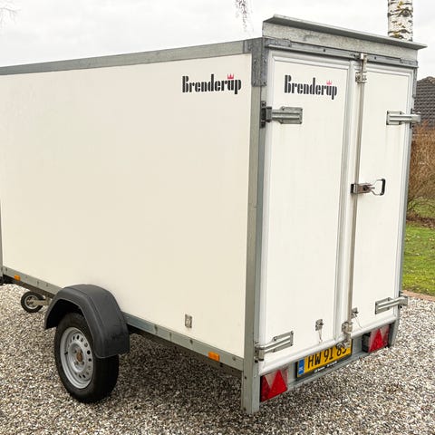 Velholdt trailer med lukket kasse, dobbelt aksel og grå farve. Traileren er velegnet til transport og opbevaring af udstyr og varer.