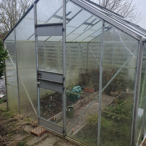 Drivhus i glas og metal, velegnet til dyrkning af planter og grøntsager. Konstruktionen består af glaspaneler i metalramme, som sikrer lysindfald og beskyttelse mod vind og vejr. Passer til havebrug og hobbygartneri.