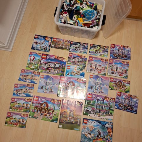 Blandet Lego med bla. disney og friends - inkl. lyserød opbevaringsboks- manualer til det meste