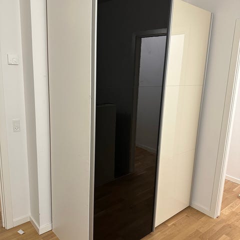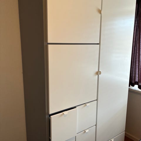 Ikea tøjskab, brugt men er i god stand der er tilsat 2 spejle men de kan sagtens fjernes. Døren øverst til højere er lidt løs men den skal bare strammes op. Skal bæres ned fra 1 sal i et rækkehus, den skal måske skilles en smule ad for at komme igennem døren.