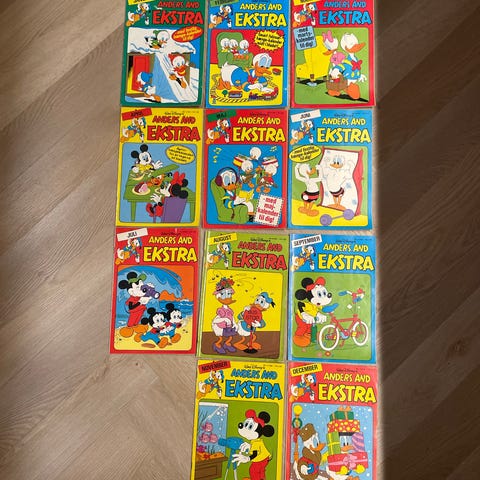 Anders And Ekstra tegneserieblade med forskellige udgaver fra flere måneder. Indeholder klassiske Disney-tegneserier med karakterer som Anders And, Rip, Rap og Rup samt andre figurer. Hver udgave har farverige forsider med illustrationer og temaer som frimærkeplakater og kalender-plakater.