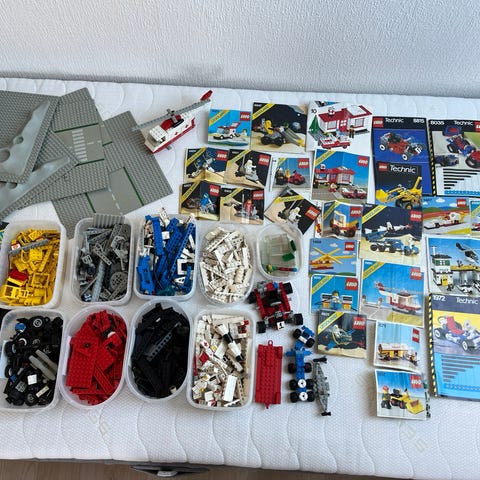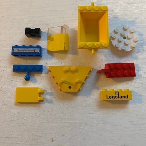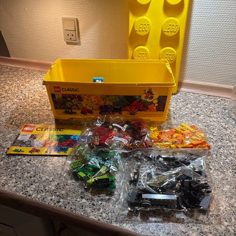 LEGO Klassisk LEGO sæt med forskellige byggeklodser, herunder træer, møbler og en gul bygning med røde døre og vinduer. Sættet indeholder dele i farverne gul, rød, blå og grøn, og inkluderer små tilbehørsdele som stole, borde og figurer. Velegnet til kreativ leg og byggeri.